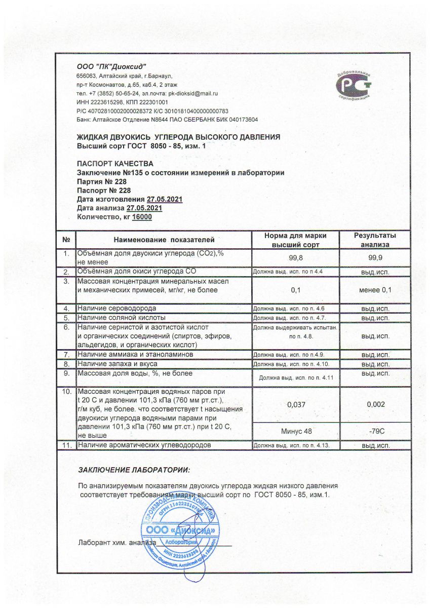 ПАСПОРТ КАЧЕСТВА: ЖИДКАЯ ДВУОКИСЬ УГЛЕРОДА ВЫСОКОГО ДАВЛЕНИЯ