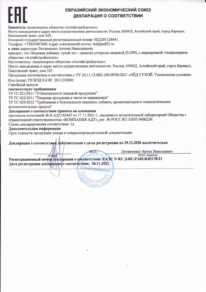 СЕРТИФИКАТ СООТВЕТСТВИЯ: ДВУОКИСЬ УГЛЕРОДА (СУХОЙ ЛЕД)