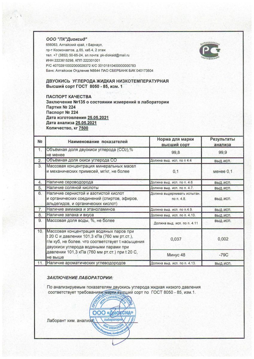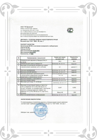 ПАСПОРТ КАЧЕСТВА: ДВУОКИСЬ УГЛЕРОДА ЖИДКАЯ НИЗКОТЕМПЕРАТУРНАЯ