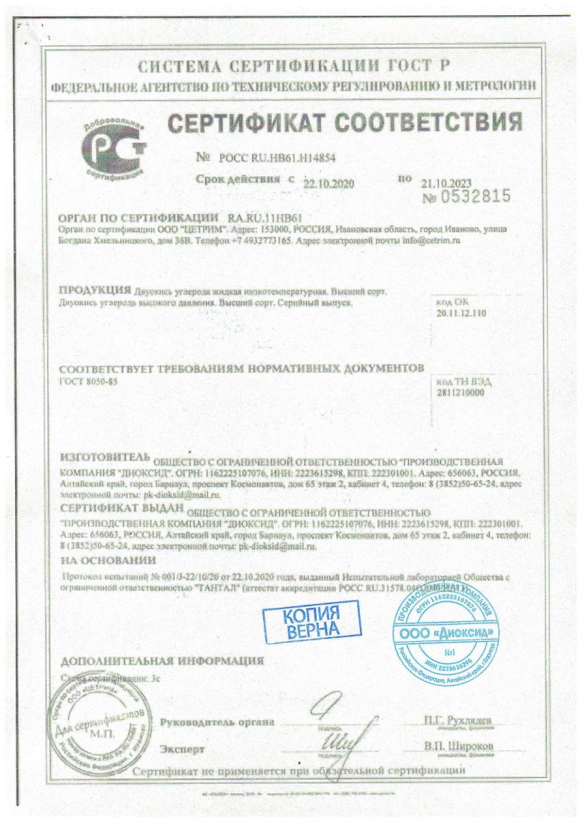 СЕРТИФИКАТ СООТВЕТСТВИЯ: ДВУОКИСЬ УГЛЕРОДА ЖИДКАЯ НИЗКОТЕМПЕРАТУРНАЯ